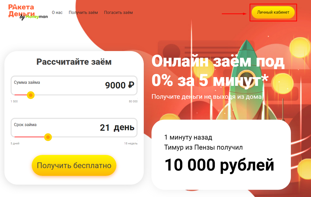 - Зайдите на официальный сайт МФО “Ракета-деньги” и найдите раздел "Личный кабинет".
