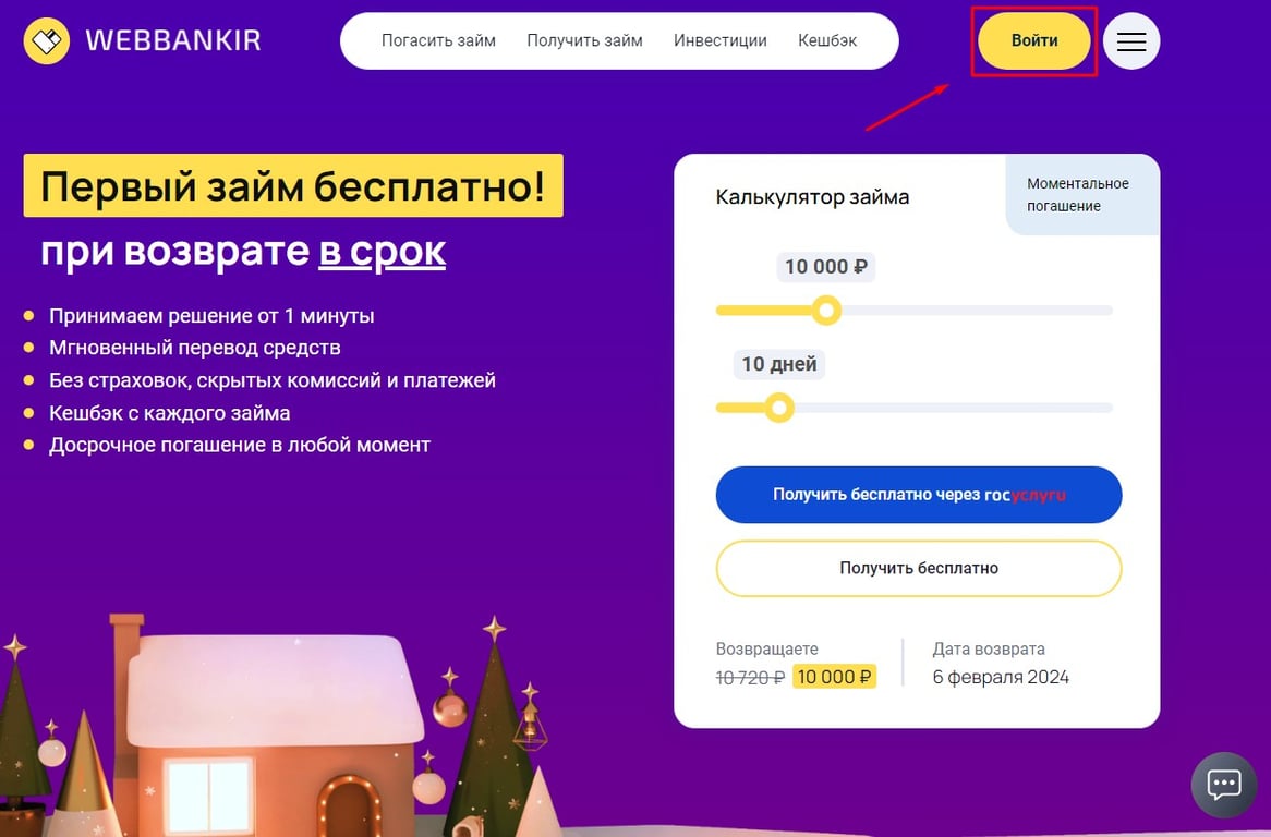- Перейдите на сайт МФО Webbankir и найдите раздел "Войти".
